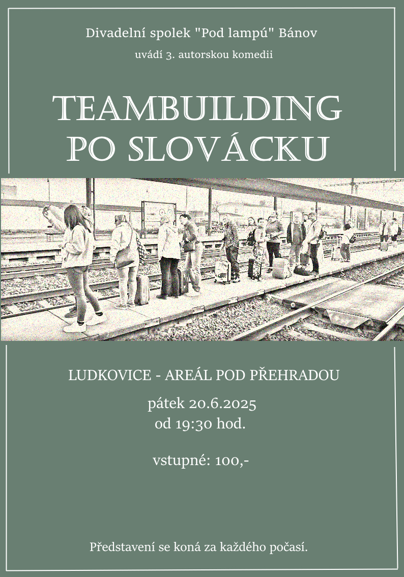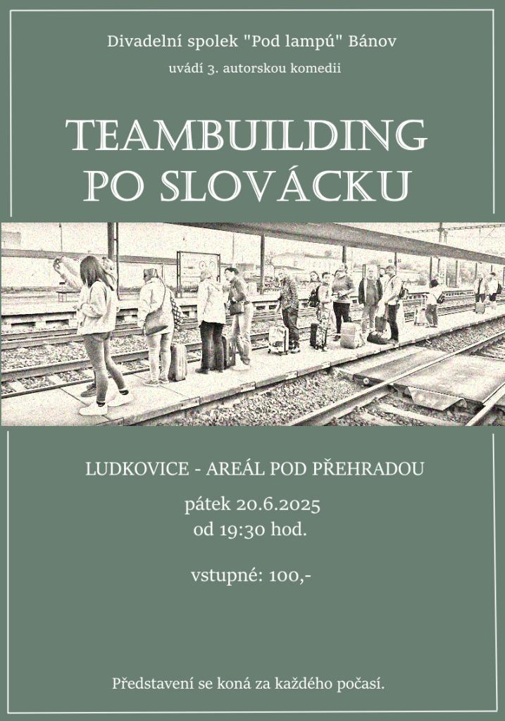 Plakát zve na třetí autorskou komedii Teambuilding po slovácku, kterou uvede divadelní spolek „Pod lampú“ Bánov. Představení proběhne v pátek 20. června 2025 od 19:30 v areálu pod přehradou v Ludkovicích. Vstupné činí 100 Kč a akce se koná za každého počasí.