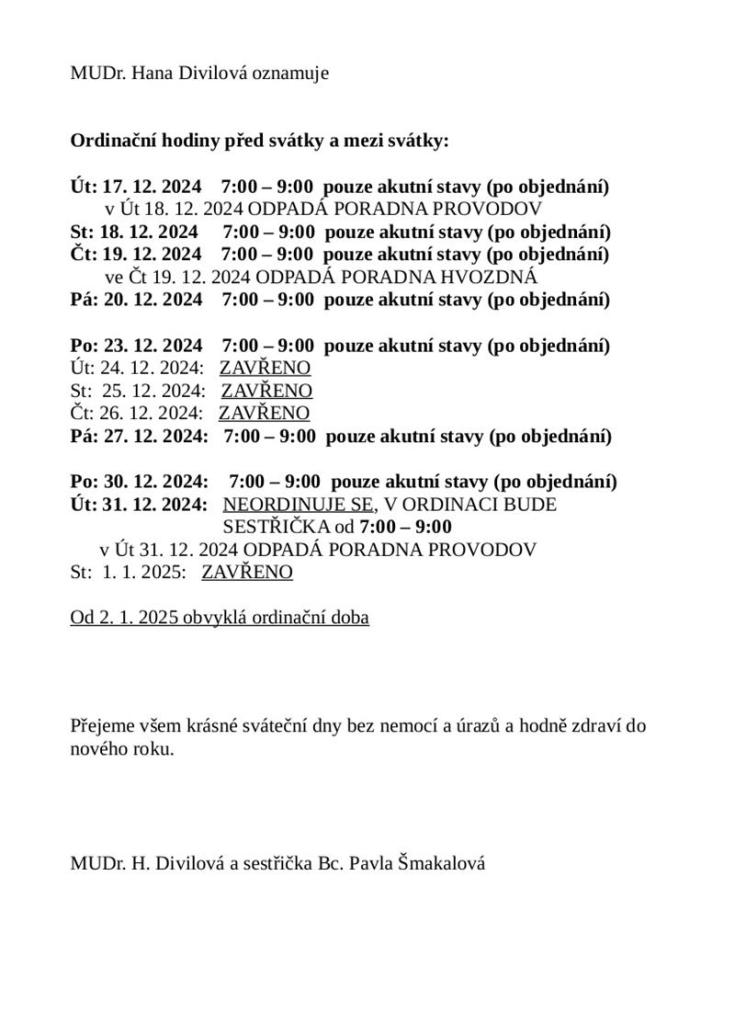 MUDr. Hana Divilová oznamuje - ordinace ve vánočním období